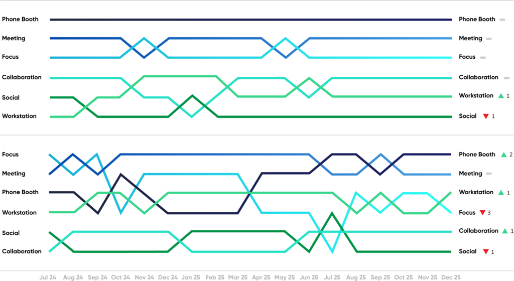 The insights can help organizations inform their own workplace strategy, when it comes to smarter and more effective space management for hybrid work and / or making design decisions for workplace and real estate optimization.