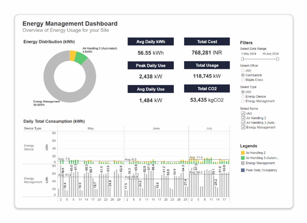 Gain further insight into your organization’s energy consumption by utilizing advanced filters on your live and historic data visualization.